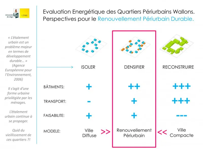La recherche mobilise deux leviers d'action pour investiguer la question de la transition durable des territoires périurbains: la forme urbaine et la mobilité. Trois types de scénarios centrés sur une évolution du stock bâtit existant sont modélisés et évalués (la rénovation énergétique, la densification et la démolition/reconstruction) afin de déterminer comment intervenir dans les quartiers périurbains existants et où intervenir. Les résultats montrent que le renouvellement périurbain par densification des quartiers les mieux localisés permet de dépasser le clivage traditionnel entre les modèles de la "ville compacte" et de la "ville diffuse", en offrant de véritables opportunités pour la transition durable des quartiers périurbains existants.
