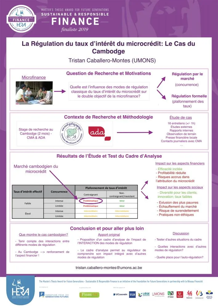 La microfinance a pour objectif de favoriser la finance inclusive. Elle consiste à fournir des services financiers de base à des populations précarisées exclues de la finance traditionnelle, tout en assurant la rentabilité financière des opérateurs. Mais les critiques se sont accumulées sur elle ces dernières années, particulièrement sur la question de la hauteur des taux d'intérêt pratiqués et, à travers celle-ci, sur la capacité de la microfinance à atteindre sa dualité d'objectifs (sociaux et financiers). Le travail de Tristan Caballero-Montes a exploré diverses voies susceptibles de réguler les taux d'intérêt du microcrédit afin d'éviter certaines dérives. Les deux voies étudiées ici sont le contrôle étatique et l'influence de la concurrence. L'originalité de l'approche est d'avoir établi un cadre théorique sur la base de huit situations, définies selon trois critères : le taux d'intérêt effectif (bas ou élevé), la concurrence (limitée ou intense) et la présence - ou non - d'un plafond imposé de taux d'intérêt. Pour chacun des scenarii envisagés, les impacts positifs et négatifs ont été définis tant sur le plan social que financier. A l'occasion d'un stage réalisé au sein de la Cambodia Microfinance Association, ce cadre théorique a ensuite été appliqué au cas particulier du marché cambodgien (2 millions de bénéficiaires), mettant en évidence les singularités, forces et faiblesses de celui-ci.