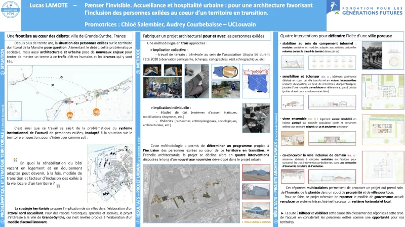 Le jury applaudit ce travail de haute qualité qui traite avec profondeur et à 360° d’un sujet très actuel : celui de l’accueil et de l’inclusion des exilé·e·s sur un territoire donné. Le jury salue la grande implication personnelle de l’auteur au sein de ce travail, reflet de son engagement individuel pour cette thématique. L’approche, originale et bien cadrée, propose une analyse très poussée du lieu étudié en considérant autant son contexte historique et urbanistique que sa dimension humaine et sociale. Le mémoire aboutit à une proposition de design architectural innovante, accompagnée d’un travail de représentation graphique solide qui donne une bonne vision du projet proposé. Cette proposition, radicalement éloignée des politiques migratoires actuellement en application, est humaniste et montre de l’ambition. Elle inclut des recommandations concrètes quant à sa mise en oeuvre et pourrait inspirer des développements futurs sur d’autres territoires.