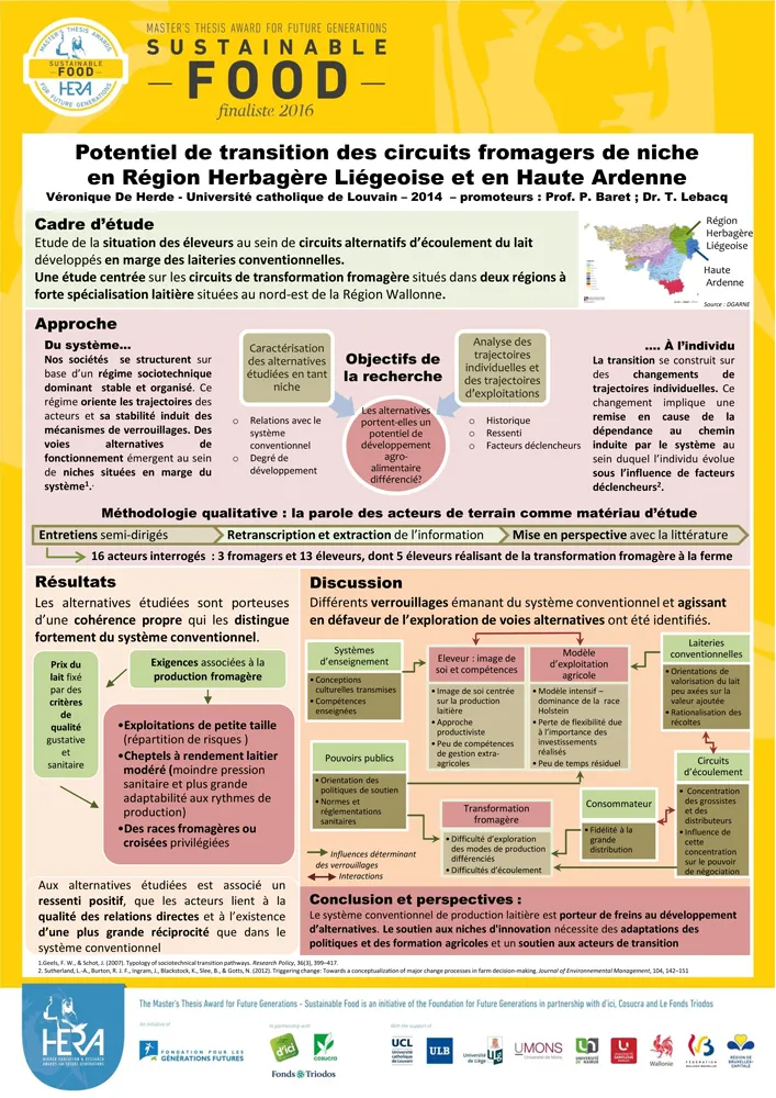 Depuis une dizaine d'années, le secteur laitier européen est confronté à la volatilité des prix et à l'internationalisation des structures de récolte de lait. Face à ce constat, Véronique De Herde s'est posé la question de la viabilité des alternatives à la livraison de lait en laiterie conventionnelle et, plus largement, de leur contribution à une société "en transition". Son attention s'est portée sur les circuits de fabrication fromagère de la Région Herbagère liégeoise et de la Haute Ardenne. A travers la rencontre avec divers profils d'éleveurs et de fromagers, elle a analysé les itinéraires de transformation des exploitations et les différents freins à cette évolution: techniques, financiers, normatifs, culturels, géographiques, etc. Elle a notamment mis en évidence la persistance du cadre de pensée conventionnel parmi ces acteurs "alternatifs". Enfin, elle a émis des recommandations (formation, sensibilisation...) susceptibles d'inspirer les politiques publiques de soutien aux circuits alternatifs.