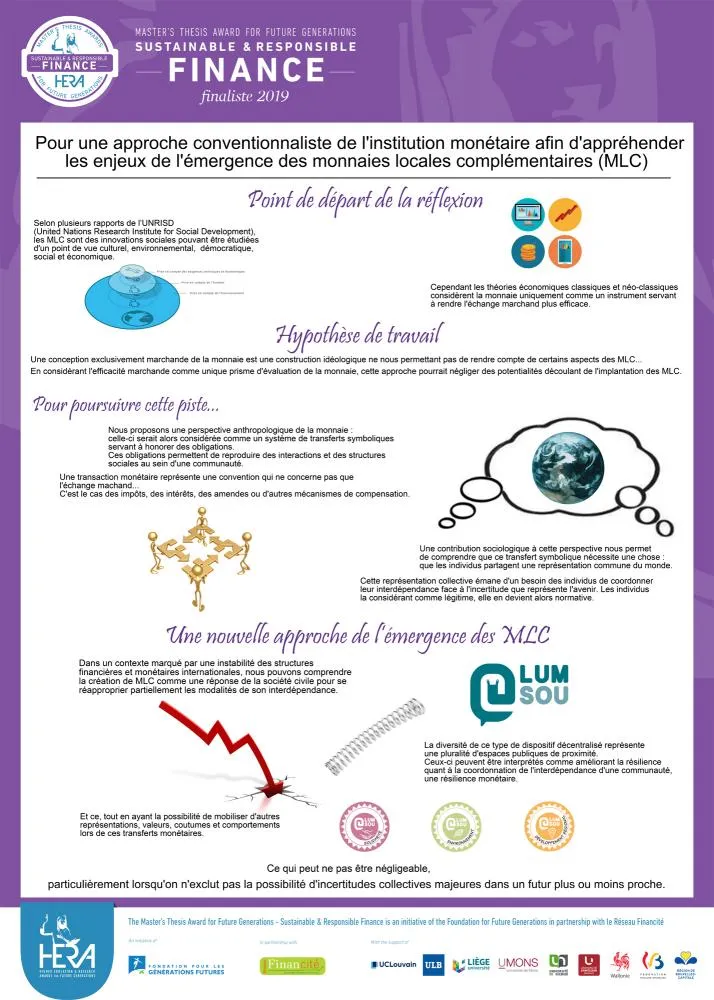 "Le jury a fortement apprécié ce mémoire passionnant qui propose un retour au fondamental : redécouvrir l’origine de l’argent. Le mémoire montre que ce type de monnaies complémentaires a un rôle social à jouer et constitue une critique du système dominant. Partant d’un sujet peu étudié dans les théories classiques de l’économie, l’auteur parvient à apporter une synthèse théorique solide, à laquelle il lie sa forte implication de terrain via l’asbl Lumsou."