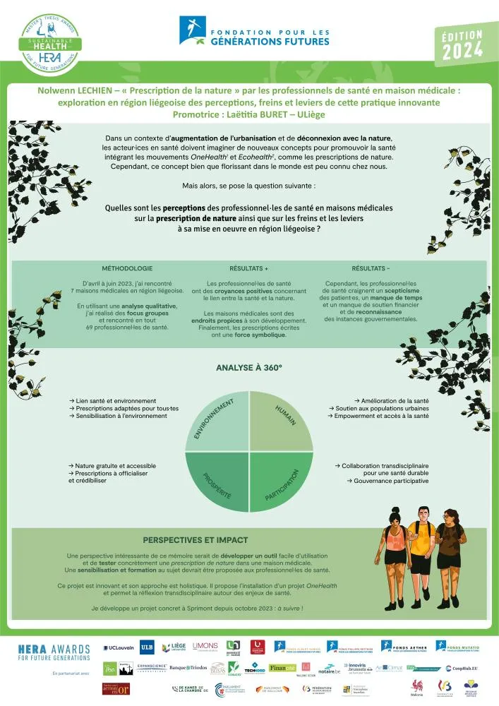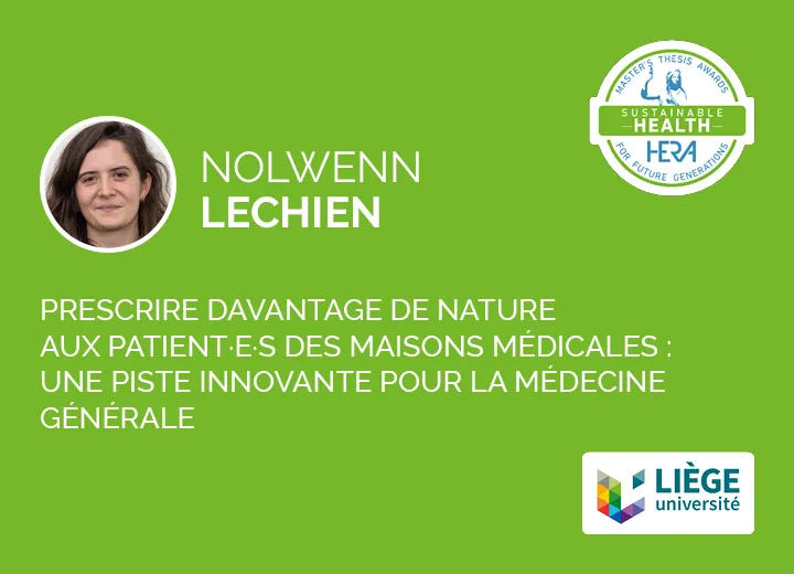 Le jury souhaite mettre en lumière le mémoire de Nolwenn Lechien, explorant les opinions des professionnel·le·s de santé sur la prescription de nature, une pratique innovante visant d’améliorer la santé physique et mentale des humains. Face à la diminution de l'exposition à la nature due à l'urbanisation, cette prescription aspire à reconnecter les individus à leur environnement naturel tout en les encourageant à le protéger. Le jury est séduit par la qualité de ce travail et se montre favorable par l’approche développée par l’autrice. Les membres du jury expriment leur enthousiasme pour cette méthode concrète pouvant faire évoluer le domaine médical et souhaitent qu’elle puisse continuer sa recherche dans un projet pilote. L'approche soutenable du mémoire est également félicitée, mettant en lumière que cette prescription ne nécessite pas trop d’investissement financier, mais plutôt un changement culturel. La méthodologie du mémoire est jugée intéressante à cet égard, car elle contribue à sensibiliser les praticiens et les patients aux implications de la prescription de nature. Les membres du jury apprécient également que le mémoire contienne une étude de terrain interrogeant des professionnelles de la santé venant de 7 maisons médicales liégeoises, ce qui ajoute une dimension de « participation » à l'exploration des freins et des leviers. Pour compléter l’étude, le jury suggère d'explorer également les perspectives des prescripteurs déjà convaincus de la méthode et des patient·e·s. De plus, ils recommandent d'envisager l'extension du projet aux médecins libéraux et d'analyser la mise en place de ce modèle en Belgique, tout en examinant les pays qui appliquent déjà cette technique, comme l'Angleterre.
