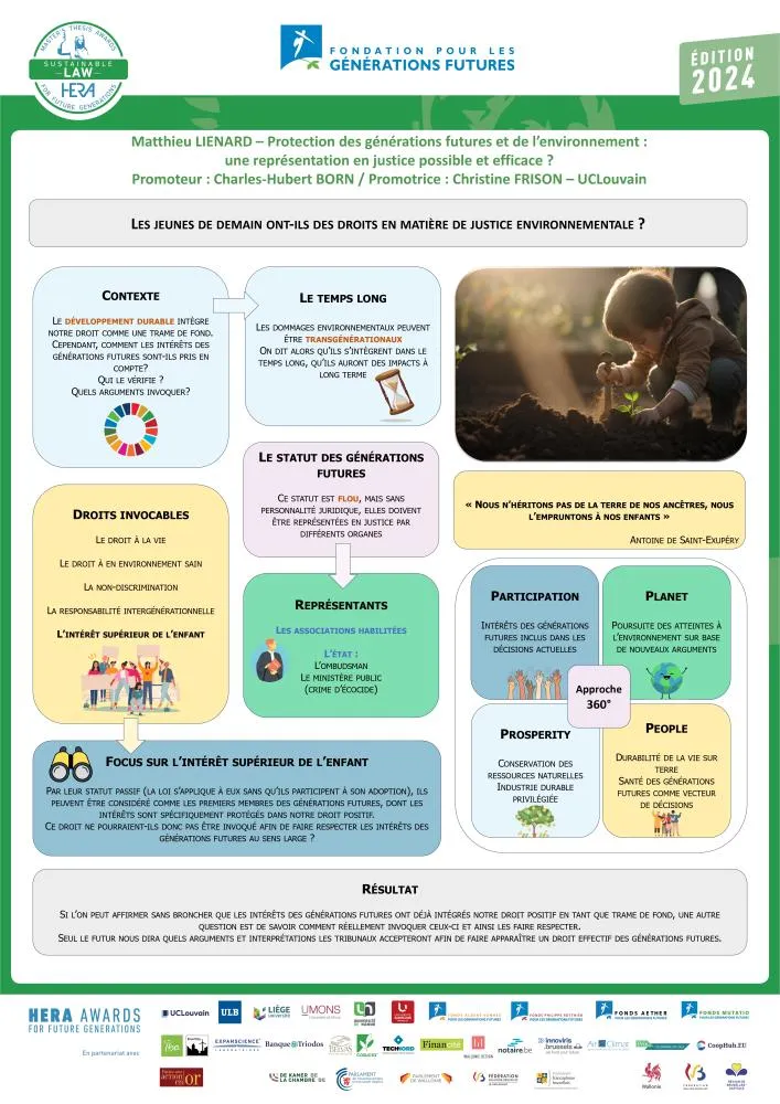 Le jury a beaucoup aimé le mémoire de Matthieu Liénard, dont l’approche méthodologique est originale et dont la thématique – l’intégration des générations futures dans la justice environnementale belge –permet de soulever de grandes questions philosophiques. Le jury a apprécié l’intérêt porté à la reconnaissance de la personnalité juridique en droit de l'environnement, l’étude peu courante de la responsabilité civile et de l’intérêt supérieur de l’enfant, la mise en évidence du poids de la justice transgénérationnelle ainsi que la comparaison entre les niveaux belge et européen. Dans le cas d’une éventuelle poursuite des recherches, le jury estime qu’il pourrait être intéressant de compléter la liste des différents acteurs et droits invocables par une analyse plus approfondie des affaires « Climat » et « Urgenda », des relations entre pouvoirs judiciaire et législatif, mais aussi du lien avec les droits de la troisième génération (droits collectifs). Le jury a souhaité mettre ce travail en lumière, car la prise en compte des intérêts des générations futures dans les décisions juridiques est un enjeu majeur sur lequel il faut avancer et que ce mémoire constitue une belle source d’inspiration pour les juristes, notamment dans le cadre de plaidoiries dans des affaires impliquant la défense de l’environnement et les générations futures.