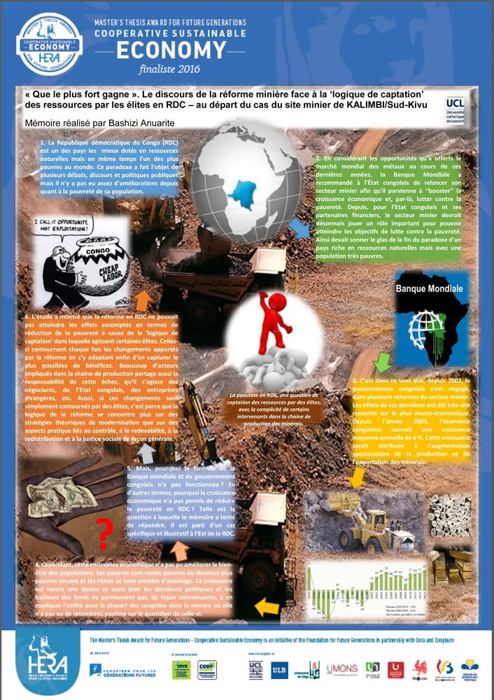« Avec la nomination de ce mémoire, coup de cœur du jury, le jury a voulu souligner que les questions de développement durable sont un enjeu planétaire : elles ont autant d’importance ici que là-bas. Anuarite Bashizi met le doigt sur le fait que la situation en RDC, tant au niveau des coopératives qu’au niveau des quatre dimensions du développement durable est très embryonnaire et que tout reste à faire. »