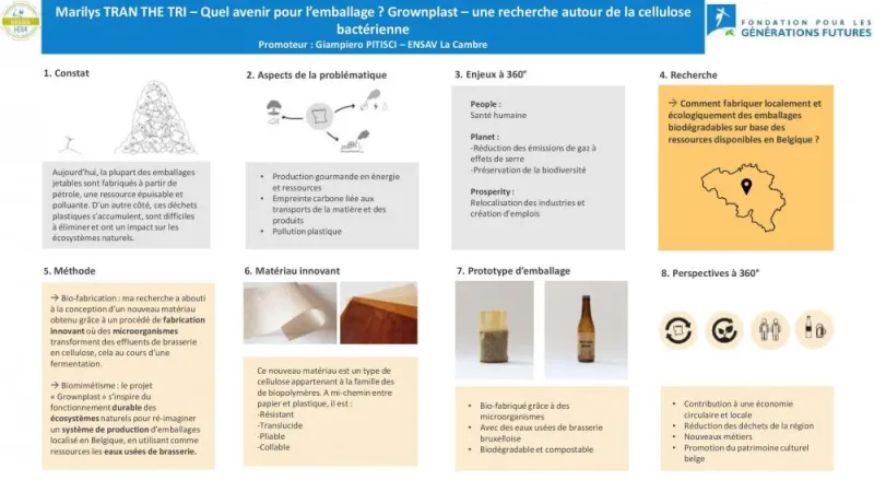 Le travail de Marilys Tran souhaite apporter une réponse à deux constats interpellants. À l’heure actuelle, 40 % des déchets plastiques sont constitués d’emballages à usage unique. De plus, le taux de recyclage mondial des matières plastiques atteint 14 %. Marilys Tran s’est intéressée à la cellulose bactérienne, un biopolymère naturellement formé par certains types de bactéries au cours d’un processus de fermentation. Par divers tests menés en laboratoire, elle a cherché à savoir s’il était possible de remplacer la matière première généralement utilisée à cette fin (thé vert ou noir) par des déchets locaux. Elle en a conclu que la ressource locale la plus intéressante en Belgique, tant sur le plan écologique qu’économique, serait les eaux usées engendrées par le brassage de la bière. Ce déchet, disponible abondamment, ne bénéficie que de très peu de voies de valorisation. In fine, la feuille de matière issue de ce processus présente des qualités intéressantes dans le domaine de l’emballage : souplesse, résistance et transparence. Elle est également biodégradable en compost. Un brevet a été déposé.