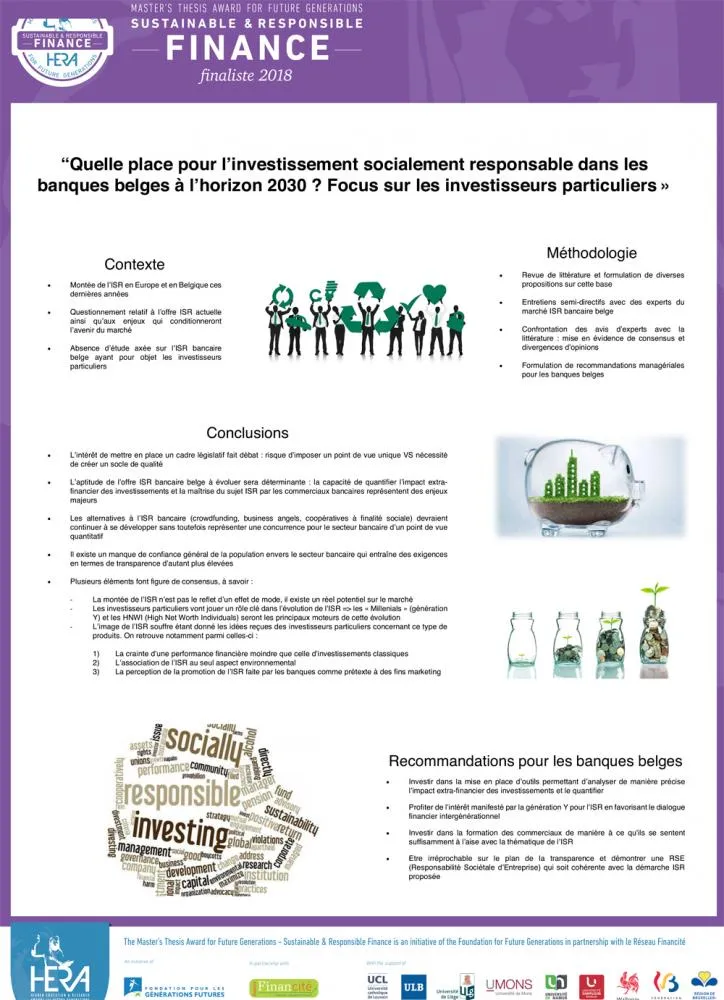 "Synthétique et pédagogique, ce mémoire constitue un bel outil de diffusion pour expliquer la notion d'investissement socialement responsable. Le jury a particulièrement apprécié la démarche prospective réalisée par l'étudiant. La grande majorité des recommandations sont pertinentes et potentiellement applicables, comme par exemple le point sur les besoins en formation des acteurs des banques à tous les niveaux (...)"