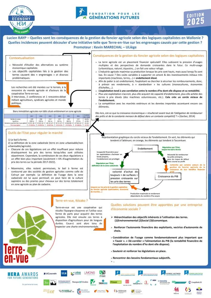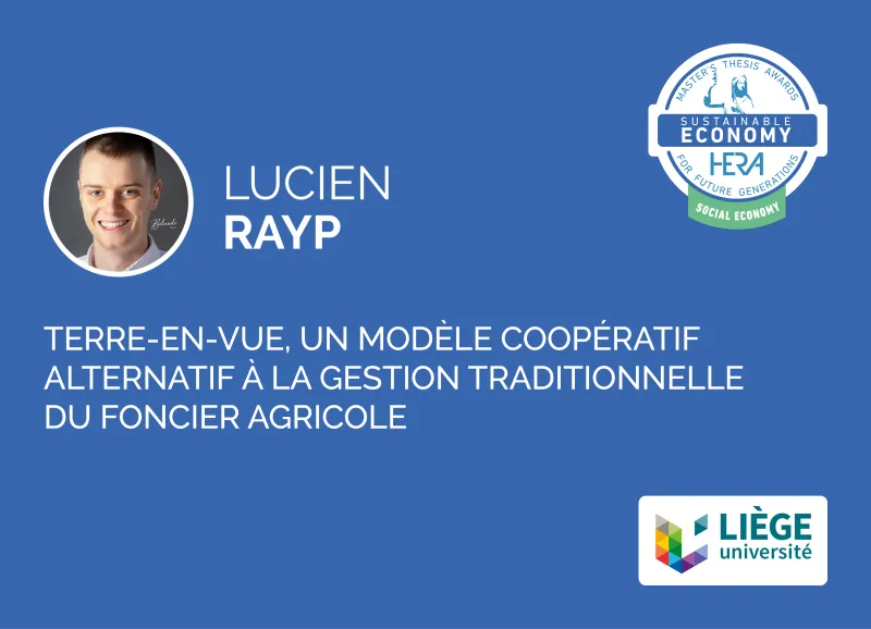 Pour la deuxième édition du HERA Award Sustainable Economy | Social Economy, le jury souhaite distinguer le mémoire de Lucien Rayp qui propose à la fois une analyse critique du modèle capitaliste et une proposition de modèle alternatif fondée sur l’analyse d’un cas concret exemplaire : la coopérative Terre-en-Vue. Dans son mémoire, l’auteur propose tout d’abord une analyse fine de la gestion du foncier agricole selon le système économique capitaliste traditionnel permettant d’en comprendre de façon claire et précise les rouages et les limites intrinsèques. L’auteur étudie ensuite dans quelle mesure un changement de paradigme peut répondre à ses limites et proposer une autre vision grâce aux principes de l’économie sociale.