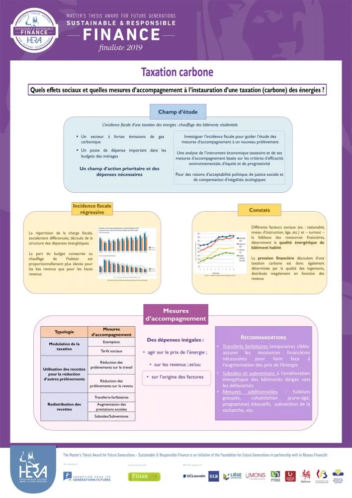 Le travail de Clément Bourtembourg porte sur les instruments de marché utilisés dans le cadre de la politique climatique et, plus particulièrement, sur la taxation dite "carbone" des énergies fossiles. L'originalité de son approche est d'avoir exploré les effets sociaux de ce type de prélèvement de même que l'objection souvent émise à son encontre (il frapperait plus lourdement les ménages les moins aisés). L'auteur a d'abord étudié cet effet, qualifié fiscalement de régressif, ainsi que ses racines. Il a ensuite proposé une série de mesures d'accompagnement à la taxation carbone au travers d'un triple prisme (l'efficacité environnementale, l'équité et l'amélioration de la progressivité fiscale), analysant tant les avantages que les inconvénients de ces mesures. Il a notamment mis en évidence le constat selon lequel les inégalités entre hauts et bas revenus se matérialisent sur divers facteurs dont celui de l'efficience énergétique des habitations : la moins bonne qualité énergétique des logements occupés par les bas revenus (dans le secteur du chauffage résidentiel) exacerbe le caractère régressif attribué à la taxation carbone. Il a également établi que, plus que l'exonération de certaines catégories de la population ou la réduction d'autres prélèvements fiscaux, la redistribution des recettes de la taxe carbone est la mesure phare d'accompagnement à privilégier (via des subsides et des transferts forfaitaires ciblés). Elle est, en effet, marquée par une plus grande acceptabilité politique et par une plus grande compatibilité entre justice sociale et mesure environnementale efficace.