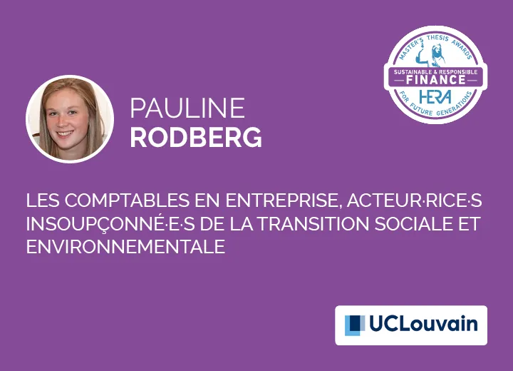 À l’unanimité, le jury adresse ses félicitations à Pauline Rodberg pour le travail courageux qu’elle a mené sur la comptabilité, sujet technique ardu et hors des sentiers battus. L’enjeu étudié est majeur : la réforme du système de comptabilité est intrinsèquement systémique et essentielle dans le développement de la finance durable (comptabilité carbone, ESG, etc.). Une comptabilité respectueuse de l'environnement peut en effet avoir un impact considérable sur le processus décisionnel des entreprises. Les recherches effectuées par l’auteure sont solides, bien documentées et appuyées notamment sur des interviews réalisées auprès d’acteurs qui utilisent le modèle CARE. L’auteure pourrait compléter son travail par une analyse des liens entre le modèle CARE et les autres systèmes de comptabilité ESG (PCAF, GRI, etc.), ainsi que par une étude des moyens à mettre en oeuvre pour passer d’un modèle à un autre et de la faisabilité (méthodologique et financière) pour de plus petits acteurs d’utiliser deux systèmes de comptabilité en parallèle, le cas échéant.
