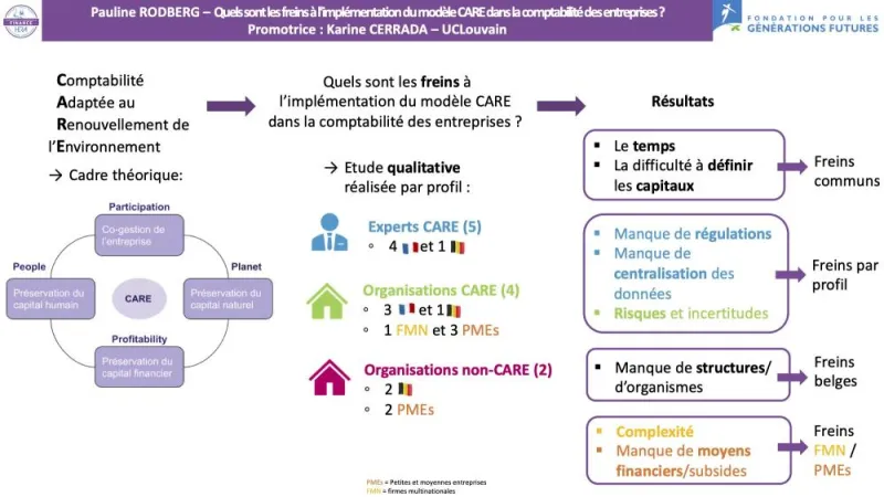 Le travail de Pauline Rodberg a consisté à identifier les raisons pour lesquelles le modèle CARE (Comptabilité Adaptée au Renouvellement de l’Environnement), créé en 2012 et assez singulier dans les systèmes de comptabilité environnementale, reste encore très peu utilisé en Belgique. La particularité de ce référentiel comptable est d’ajouter au traditionnel bilan comptable financier un bilan sur le capital humain et un bilan sur le capital naturel afin de s’inscrire dans la transition sociale et écologique des entreprises. L’auteure a étudié les douze postulats du CARE et formulé quatre hypothèses de limites pratiques à son utilisation : aspect chronophage, poids financier, manque de notoriété et non-reconnaissance par les normes internationales IFRS. Via des entretiens semi-directifs, elle a ensuite soumis ces hypothèses à con/infirmation auprès de sept expert·e·s du modèle CARE ou acteur·e·s de la transition entrepreneuriale. Enfin, elle a confronté ses conclusions aux limites plus générales de toute démarche de type RSE.