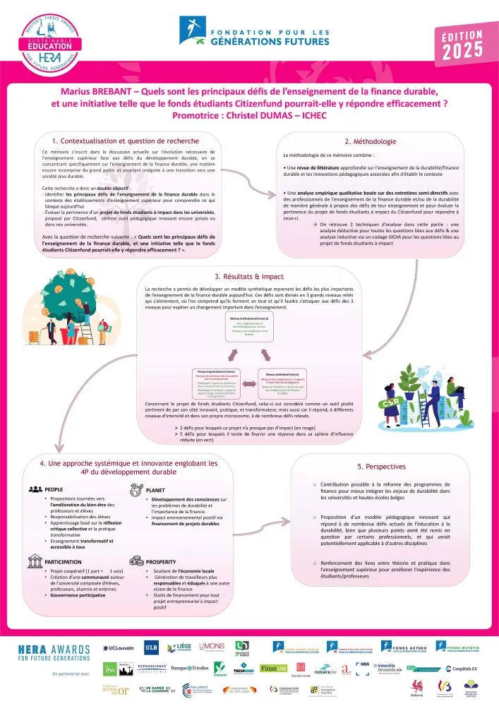 Le jury souhaite mettre en lumière le mémoire de Marius Brebant qui s’ancre pleinement dans la dynamique actuelle d’évolution nécessaire de l’enseignement supérieur face aux défis du développement durable, spécifiquement dans le domaine de l’enseignement de la finance durable.