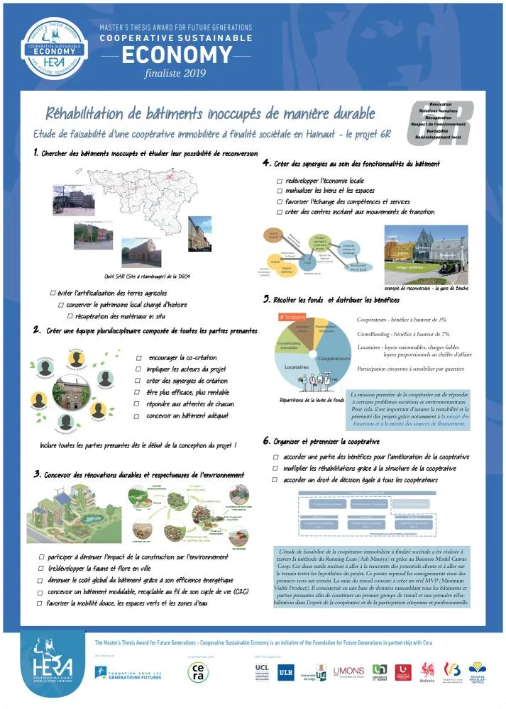 Louise Claerbout a étudié la faisabilité et la viabilité financière d'une coopérative à finalité sociétale spécialisée dans la réhabilitation des bâtiments à l'abandon dans la région de Mons-Borinage. Son travail s'enracine dans un double constat. Primo, le secteur de la construction est à la fois un important consommateur d'énergies fossiles et un gros émetteur de dioxyde de carbone. Secundo, l'artificialisation des terres agricoles s'accélère. Le type de réhabilitation visée se veut respectueux de l'environnement et de la santé des occupants, mais aussi favorable aux activités économiques locales et à haut degré participatif des acteurs concernés. Les différents outils de développement stratégiques utilisés par l'auteure ont eu pour priorité de favoriser la gouvernance participative et la gestion non-violente entre acteurs et coopérateurs pressentis. Après s'être intéressée à divers projets de la même nature présentés dans la littérature, Louise Claerbout a rencontré une série de professionnels de la région qui lui ont permis de tester trois hypothèses critiques pour la réussite de son projet : le profil des investisseurs, la possibilité de partenariats et l'intérêt des utilisateurs. Son projet de créer concrètement une coopérative baptisée "6R" (Rénovation - Relations humaines - Respect de l'environnement - Rentabilité - Récupération des matériaux - Redéveloppement local) a été appliqué à la réhabilitation/transformation de la caserne des pompiers de Jemappes en un centre d'accueil pour artistes.