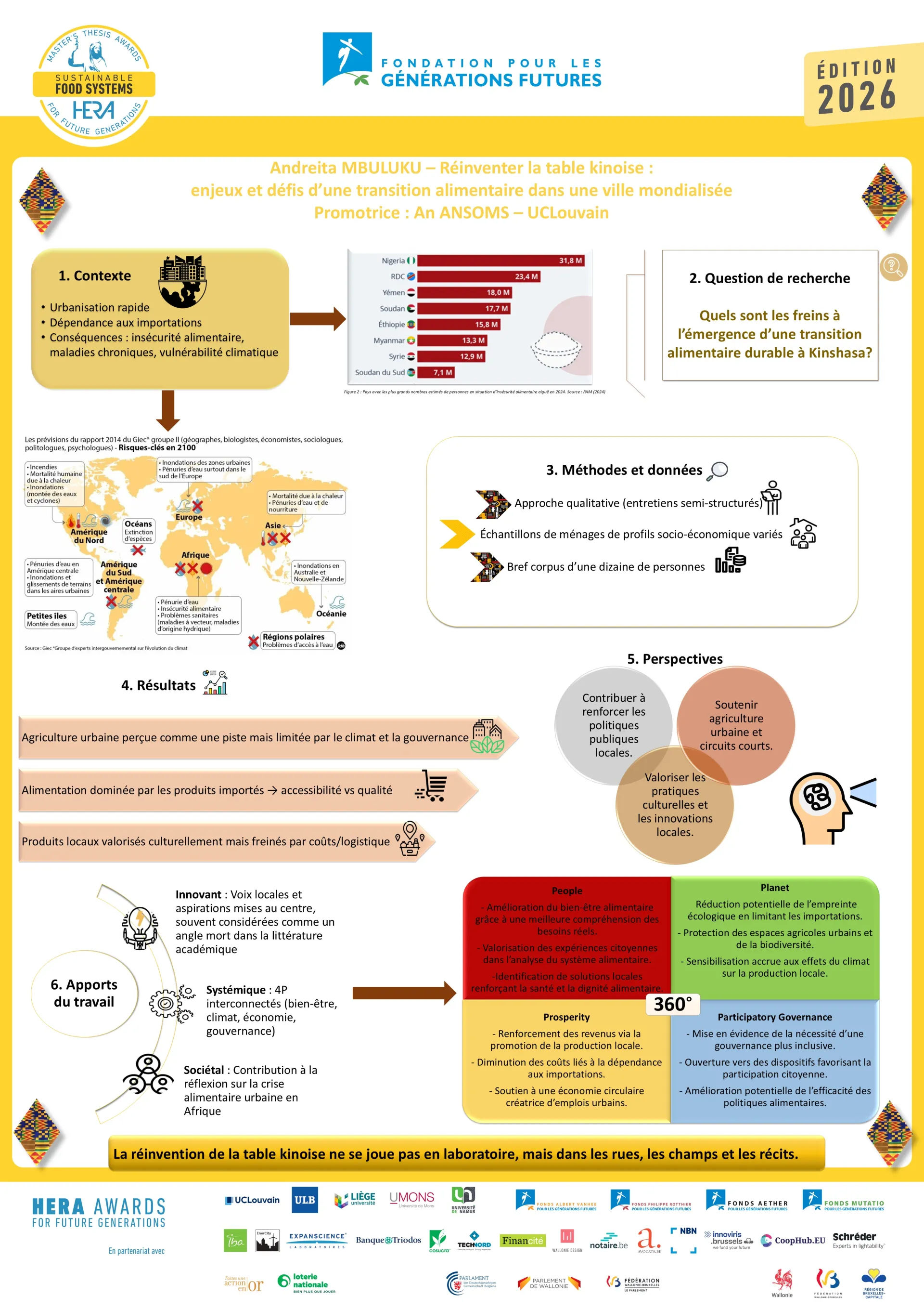 Le travail d’Andreita Faïda Mbuluku interroge la faisabilité d’une transition alimentaire durable dans la ville-province de Kinshasa, RDC. L’autrice a d’abord mis en lumière les particularités du contexte local et ses évolutions récentes, posant par ailleurs les concepts théoriques de son approche : souveraineté alimentaire, insécurité alimentaire, changement climatique, importations, etc. Elle a ensuite élaboré un questionnaire détaillé qu’elle a soumis à 30 ménages de la commune de Ngaliema, l’une des entités territoriales les plus vastes et les plus hétérogènes de Kinshasa. L’analyse des réponses lui a permis de mettre en évidence 4 facteurs principaux expliquant les freins à la transition alimentaire, certains assez classiques (précarité économique, défaillance des infrastructures, etc.), d’autres plus subtils comme les transformations culturelles qui redéfinissent les goûts et pratiques culinaires. Au terme de sa démarche exploratoire, l’autrice prône un modèle s’appuyant sur la valorisation des potentiels locaux, loin de la simple reproduction des modèles exogènes.