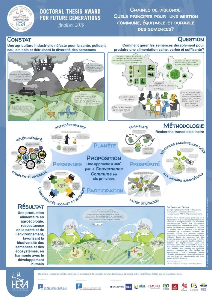 "La thèse nominée est intitulée « Towards Redesigning the Plant Commons - A Critical Assessment of the Multilateral System of Access and Benefit-sharing of the International Treaty on Plant Genetic Resources for Food and Agriculture » de Christine Frison. La thèse traite de l’accès aux semences, un enjeu crucial dans un contexte d’érosion de la biodiversité agricole et de précarisation des petits agriculteurs, avec en toile de fond le défi de nourrir une population mondiale croissante dans un contexte de changements climatiques.
