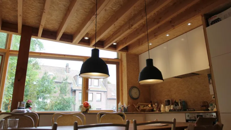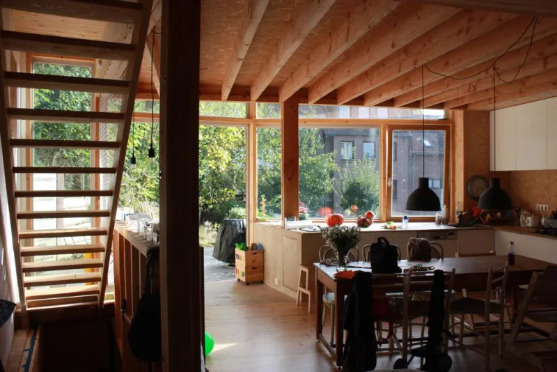 La maison basse énergie est pourvue d’une enveloppe isolante ininterrompue et fait un usage maximal de la chaleur et de la lumière du soleil. L’empreinte écologique limitée et un bilan CO2 aussi positif que possible sont obtenus grâce au choix des matériaux et des installations. L’ossature bois a été complétée par des ballots de paille et du béton de chanvre-chaux, des matériaux biodégradables et bon marché, à grande inertie thermique et régulateurs naturels de l’humidité. Le choix de vivre en ville limite les transports et favorise la mobilité douce.