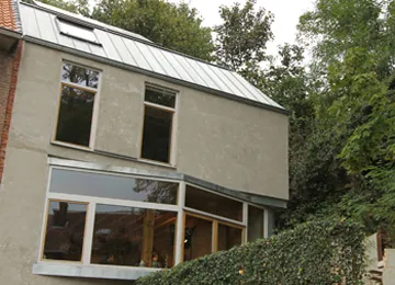 La maison unifamiliale a été construite sur une parcelle extrêmement étroite avec une grande dénivellation nécessitant le recours à des parois pour retenir la terre. C'est justement la configuration du terrain et la pente bien orientée qui ont permis à Matthieu Delatte de concevoir une habitation intégrant les principes de la bioclimatique. La façade à rue, orientée vers le sud, s'ouvre généreusement pour tirer parti de la chaleur du soleil. La façade arrière est à moitié enterrée, limitant de ce fait les pertes de chaleur du côté nord et permettant de stocker la chaleur par inertie dans un mur isolé en béton de chanvre-chaux. La ventilation n'est pas mécanique mais se fait naturellement. Le vitrage à facteur solaire élevé (g=0,64) assure la pénétration optimale de la chaleur du soleil en hiver, tandis que la végétation abondante protège la façade sud en période estivale. Le besoin de chaleur de chauffage (estimée à 41kWh/m² par an) est fourni par un poêle de masse zéro carbone. L'utilisation d'un foyer est au centre de la réflexion et de la maison. Selon Mathieu Delatte, l’homme a besoin de pouvoir se réchauffer au coin du feu. L'unique intervention technologique est l'installation en toiture de capteurs solaires thermiques et d'un boiler solaire permettant d'assurer 70% des besoins en eau chaude sanitaire. Une citerne pour la collecte des eaux de pluie a également été installée.