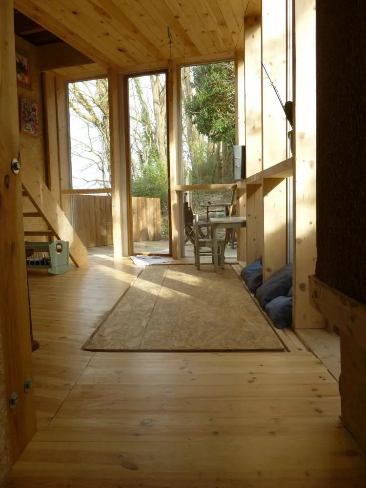Des considérations écologiques et de confort ont mené au choix de matériaux naturels pour l'isolation du bâtiment dont la structure est en bois : ballots de paille pour les murs extérieurs en élévation d'une épaisseur de 36 cm et du béton de chanvre-chaux dans les murs enterrés. Matthieu Delatte a choisi ces matériaux non seulement parce qu'ils sont entièrement biologiquement dégradables et bon marché, mais aussi en raison de leur grande inertie thermique : ils stockent la chaleur et la rendent lentement tandis qu'ils assurent la régulation du degré d'humidité de façon tout à fait naturelle. Contre le mur mitoyen, une structure en bois a été réalisée à l'intérieur de laquelle l'isolation est de la laine de bois. Les enduits extérieurs sont à base de chaux-plâtre et les enduits intérieurs à base d'argile et de chaux. Tous les matériaux de construction ont été choisis en raison de leurs caractéristiques économiques, techniques et écologiques, leur origine locale et la faculté de garantir un climat intérieur sain. Pour l'architecte, le bien-être des habitants est au coeur de sa réflexion, sans que cela ne tourne au luxe et à l'abondance. C'est la raison pour laquelle la construction est restée modeste. A l'avenir et en fonction de l'évolution de la situation financière, la maison pourra être progressivement aménagée et transformée en fonction des besoins.