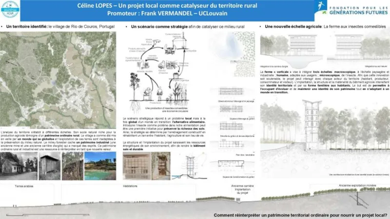 Le mémoire de Céline Lopes porte sur le village portugais de Rio de Couros, inscrit dans un territoire marqué par l’exode rural, le vieillissement de la population et le manque de perspectives économiques. Riche de l’apport théorique de quatre architectes et urbanistes, l’auteure a souhaité réinterpréter ce patrimoine territorial ordinaire et élaborer un projet local susceptible de catalyser une nouvelle dynamique de développement. Après avoir rencontré divers acteurs locaux, elle a proposé, maquette à l’appui, l’installation d’une ferme verticale axée sur la production de grillons à des fins alimentaires et ouverte aux visiteur·euse·s grâce – notamment – à un observatoire et un belvédère. Inspirée par l’économie circulaire, cette ferme serait frugale en termes de consommation d’eau, d’emprise au sol et d’utilisation de matières premières. En redonnant vie aux séchoirs à maïs ancestraux, elle serait également appelée à perpétuer une mémoire collective propre à la région.