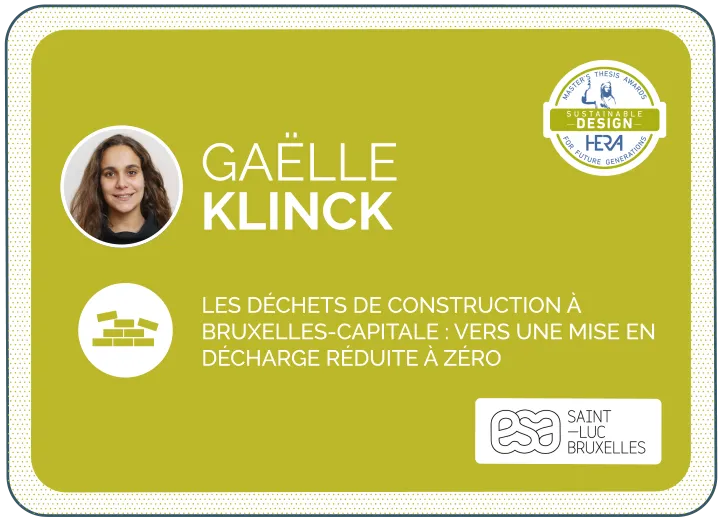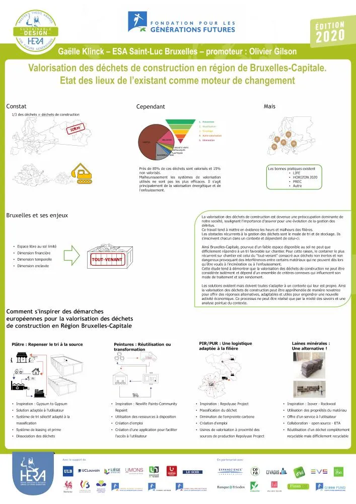 Chaque année, la Région de Bruxelles-Capitale génère quelque 700.000 tonnes de déchets issus des activités de construction, rénovation et déconstruction parmi lesquels 15 % ne font l’objet d’aucun recyclage. Après avoir réalisé un état des lieux sur les filières de valorisation existantes, Gaëlle Klinck a identifié des pratiques innovantes mises en place dans divers pays européens, en tentant de cerner les conditions auxquelles elles pourraient s’appliquer en Région de Bruxelles-Capitale. Quatre types de déchets ont été étudiés : plâtres, peintures, isolants synthétiques et isolants en laine minérale. Cette approche exploratrice a accouché d’une mise en œuvre concrète (testée par l’auteure) d’une valorisation des laines minérales. L’ensemble de son travail s’inscrit dans une double perspective : d’une part, le passage d’une économie linéaire vers une économie circulaire et, d’autre part, la mise en place de filières professionnelles plus intégrées, où le ou la créateur·rice ou la créatrice trouverait une meilleure place qu’aujourd’hui aux côtés des acteur·rice·s traditionnel·le·s du secteur de la construction.