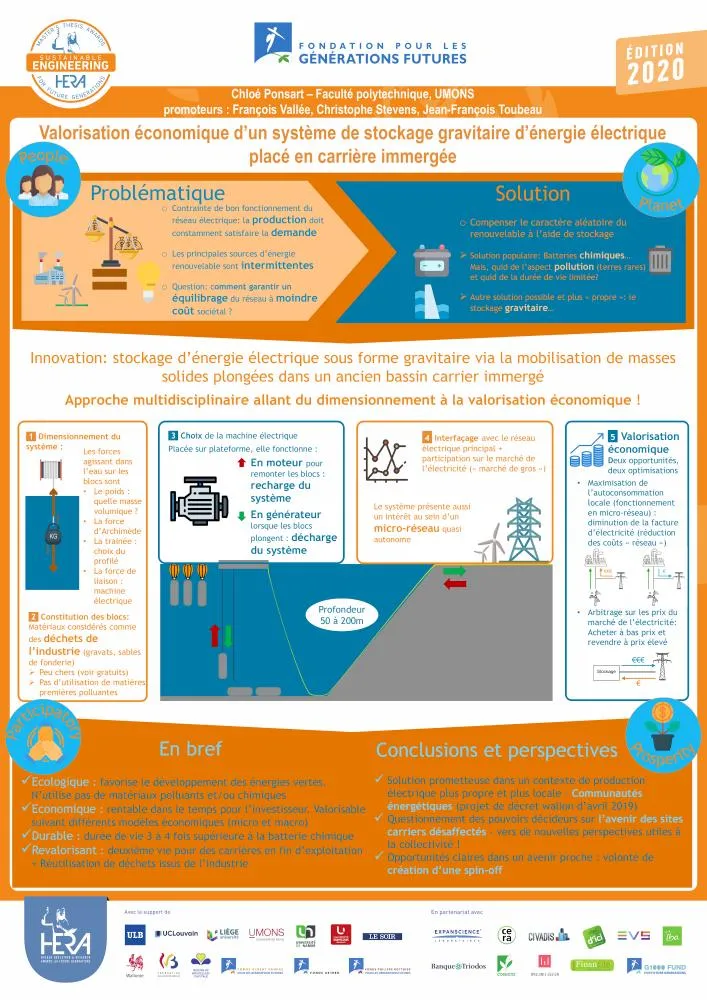 Lié (notamment) à l’irrégularité des conditions météorologiques, le problème d’intermittence dans la production des énergies vertes est généralement solutionné par la mise en marche ponctuelle d’unités de production électrique utilisant des ressources fossiles. L’auteure a étudié la faisabilité physique et financière d’une solution alternative – le stockage gravitaire par masses solides immergées – dans l’eau des carrières wallonnes désaffectées. Elle a d’abord identifié les meilleurs matériaux à utiliser dans une perspective de minimisation des nuisances environnementales. Elle a ensuite investigué la viabilité financière d’un tel système, tant dans le cadre d’une utilisation locale que dans celui d’une intégration au réseau et au marché de l’électricité. Dans les deux cas, la durée d’amortissement des installations a été estimée à dix ans, pour une durée de vie de quarante ans. L’auteure, enfin, a suggéré une adaptation du cadre législatif wallon dans le contexte des « communautés énergétiques ».