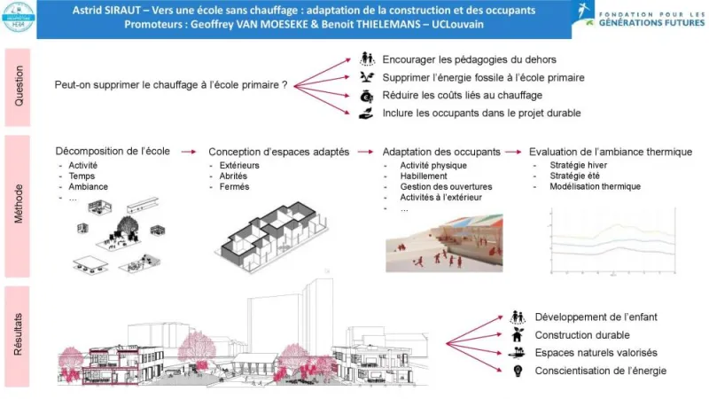 Le mémoire d’Astrid Siraut explore la faisabilité d’un bâtiment scolaire (primaire) à consommation énergétique quasiment nulle et appliquant les principes d’une pédagogie active, ouverte sur l’environnement et le quartier (école « du dehors »). Elle propose une déconstruction de concepts considérés comme acquis, tel le « confort thermique », qu’elle met en résonance avec les principes pratiqués par diverses écoles à pédagogie alternative. Elle repense ensuite les espaces éducatifs, les conditions d’ambiance intérieure, les constructions architecturales et redéfinit jusqu’aux activités scolaires elles-mêmes, aboutissant à la conception d’un prototype d’école bioclimatique, composée de modules utilisables en fonction des activités du moment. Enfin, elle modélise ces modules afin d’en vérifier l’ambiance thermique. Son projet de recherche, basé sur une école primaire de 300 enfants, s’intègre dans le projet de revitalisation urbaine d’une friche ferroviaire à Molenbeek.