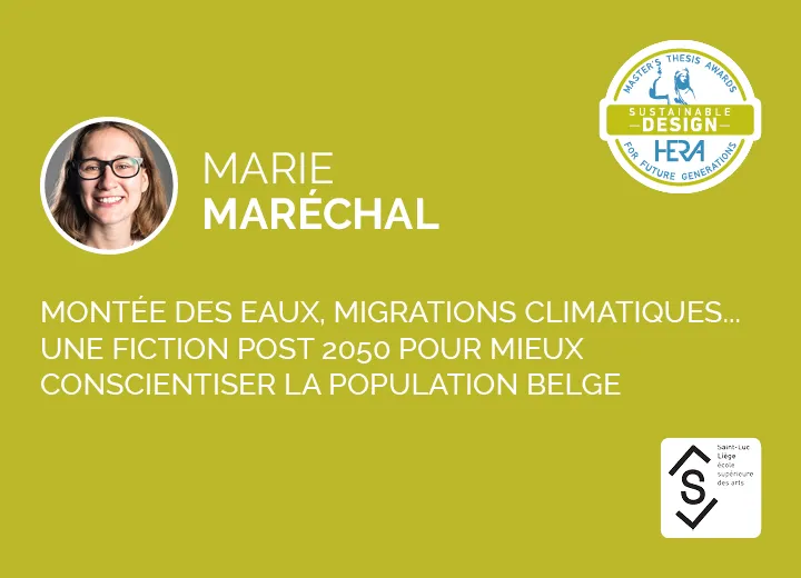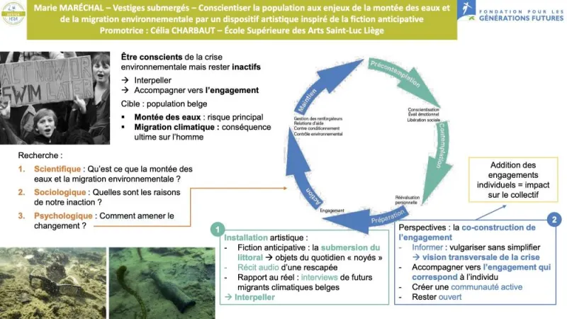 L’art est une voie efficace de sensibilisation aux enjeux de montée des eaux et de migrations climatiques. Tel est le pari du travail de Marie Maréchal qui, dans un premier temps, a exploré la psychologie du changement et la perception de la population belge face aux enjeux environnementaux. Artiste et plongeuse sous-marine, elle a ensuite mis au point un dispositif basé sur le son et l’image, mettant en scène les conséquences d’un scénario postapocalyptique scientifiquement plausible dans une Europe d’après 2050. Ce dispositif est présenté dans un espace confiné évoquant la condition de réfugié climatique. Si l’accroche initiale est volontairement émotionnelle, elle a pour but ultérieur d’emmener le spectateur et la spectatrice vers un meilleur degré de conscientisation et, ensuite, vers l’adoption à long terme de comportements pro-environnementaux en harmonie avec ses valeurs et ses convictions propres. Baptisé « Vestiges submergés », le dispositif devrait être présenté au public en situation réelle courant 2022.