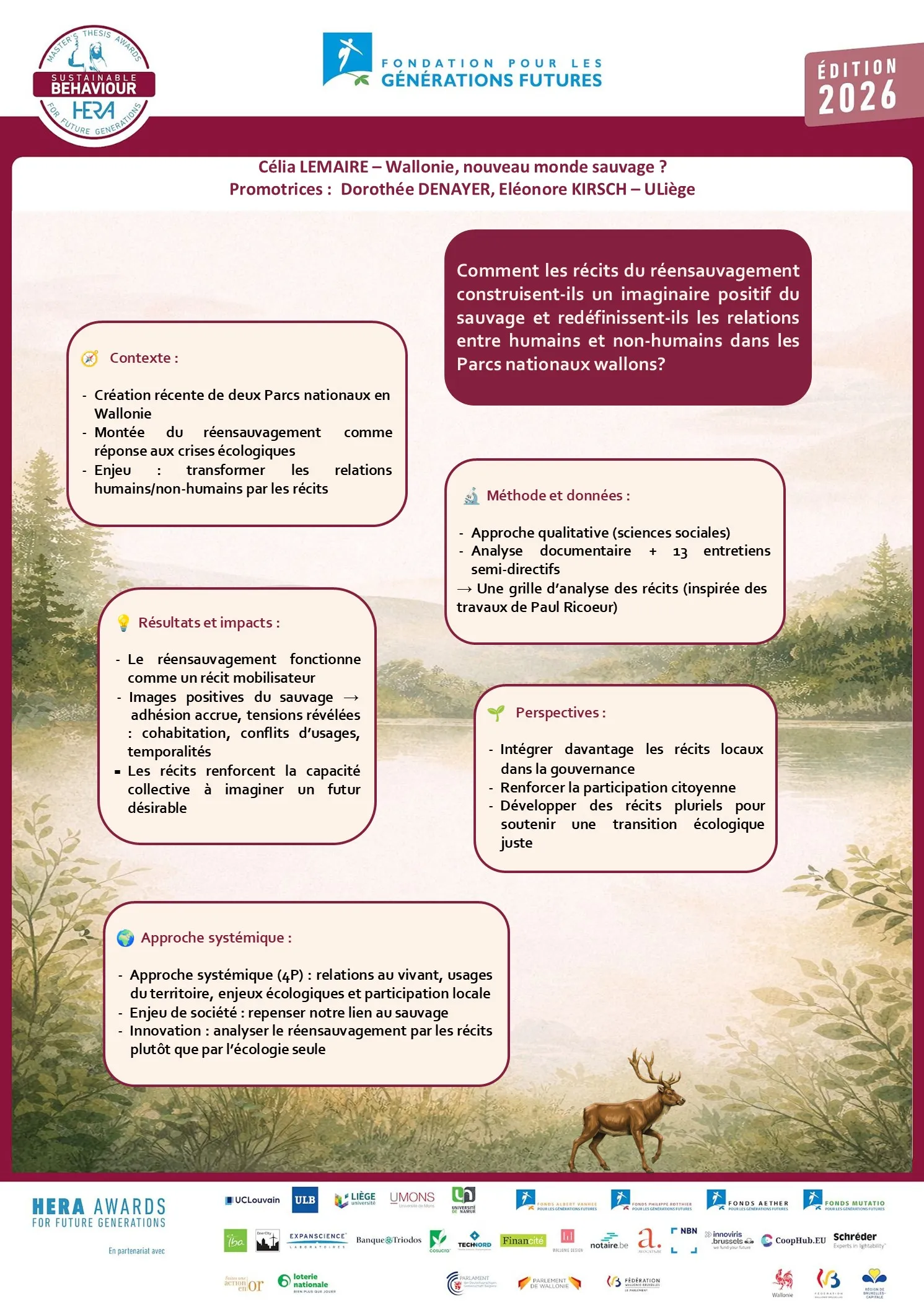 Ce travail explore la relation entre humains et non-humains, un thème que le jury considère comme original, innovant et émergent. L’autrice analyse le rôle des récits dans la construction de l’imaginaire collectif autour du « sauvage », en étudiant les récits de réensauvagement dans les Parcs nationaux wallons de la Vallée de la Semois et de l’Entre-Sambre-et-Meuse. Le jury valorise ce choix, estimant que nous avons aujourd’hui besoin de nouvelles histoires pour influencer positivement les comportements et faire avancer la transition. Les récits inspirants rendent le changement plus désirable et renforcent notre lien au vivant, notamment auprès des jeunes générations pour lesquelles ces récits contribuent à façonner une relation différente à la nature. Le jury apprécie l’utilisation de la narratologie et de la théorie du récit. Le recours à la pensée de Paul Ricoeur, pourtant exigeante, est maîtrisé et pertinent.