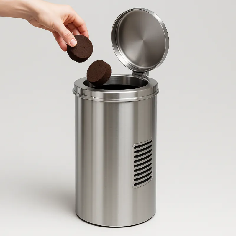 "ReGround ontstond vanuit de frustratie dat koffiedik — een perfect herbruikbaar materiaal — dagelijks als nat afval wordt weggegooid, met hoge kosten, geurhinder en schimmel tot gevolg. Door een compacte droogmachine te ontwerpen, wil ik dit afvalprobleem bij de bron aanpakken, met ecologie en gebruiksgemak voorop.