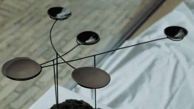 Het was hierbij de uitdaging om voor een bijna volledig organische/ gevonden materiaalkeuze te gaan. De mobiel creëert een zekere rust en harmonie door zijn voortdurende beweging. Het nodigt uit tot vertraging en verwondering, beweegt mee met de wind en balanceert zo eindeloos in de ruimte.