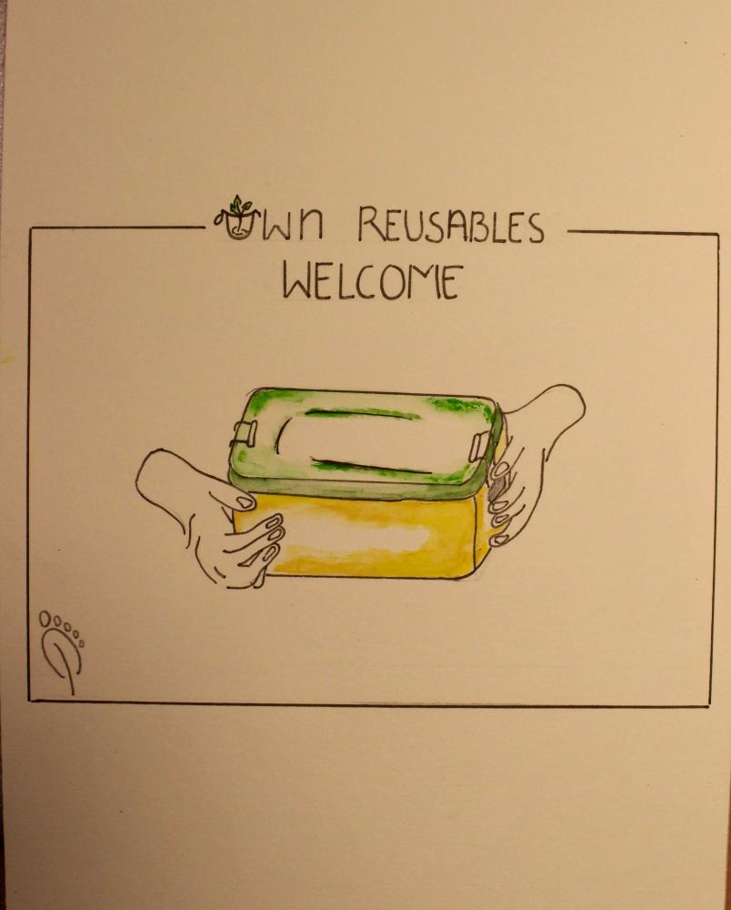 Het milieubewuste Zero Waste team van het Green Office– het duurzaamheidslab van de KULeuven – wil het grote publiek en handelaren en horeca-uitbaters (afhaalrestaurants, koffiebars…) bewuster maken van de afval- en consumptieproblematiek en het gebruik van plastic tout court terugdringen. Met hun ‘Stick to Reusables’-campagne gaan ze in gesprek met handelaren en horeca-uitbaters en delen ze een folder uit met informatie over de impact van afval en praktische tips voor afvalvermindering. Ze moedigen de handelaren en horeca-uitbaters aan om via een raamsticker aan te geven dat ze eigen, meegebrachte verpakkingen aanvaarden. De gedachte hierachter: mensen zullen sneller herbruikbare dozen en flessen durven bovenhalen als handelaren aangeven dat ze hiervoor openstaan.